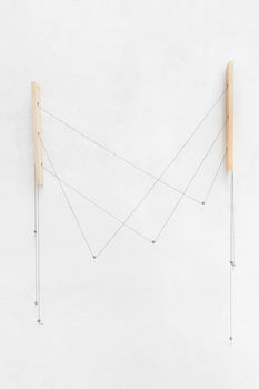 Essa ideia acima explicada: de possibilidades de atuação dentro de um dado conjunto de regras, é a essência do trabalho de Lucas Quintas. Contudo, questões como o sistema da arte não entram em seu radar, ao menos não diretamente. Sua matéria prima são elementos a princípio ordinários, mas de importância seminal em nossa existência: madeiras, pregos, linhas, fios, cordas…a lista é longa. São peças que erguem, sustentam, amarram, enfim, que dão corpo, que mantêm em pé, que tornam possível a existência das coisas tal como são. Como não poderia deixar de ser, o artista em questão atua na tridimensionalidade. Sua atuação, todavia, não é a de um escultor. Quintas não transforma a matéria, mas sim a recombina, junta, estrutura. Nesse sentido, age como um arquiteto. Não no sentido cotidiano da palavra, mas na sua essência: o que é a arquitetura senão uma estruturação e combinação de formas?